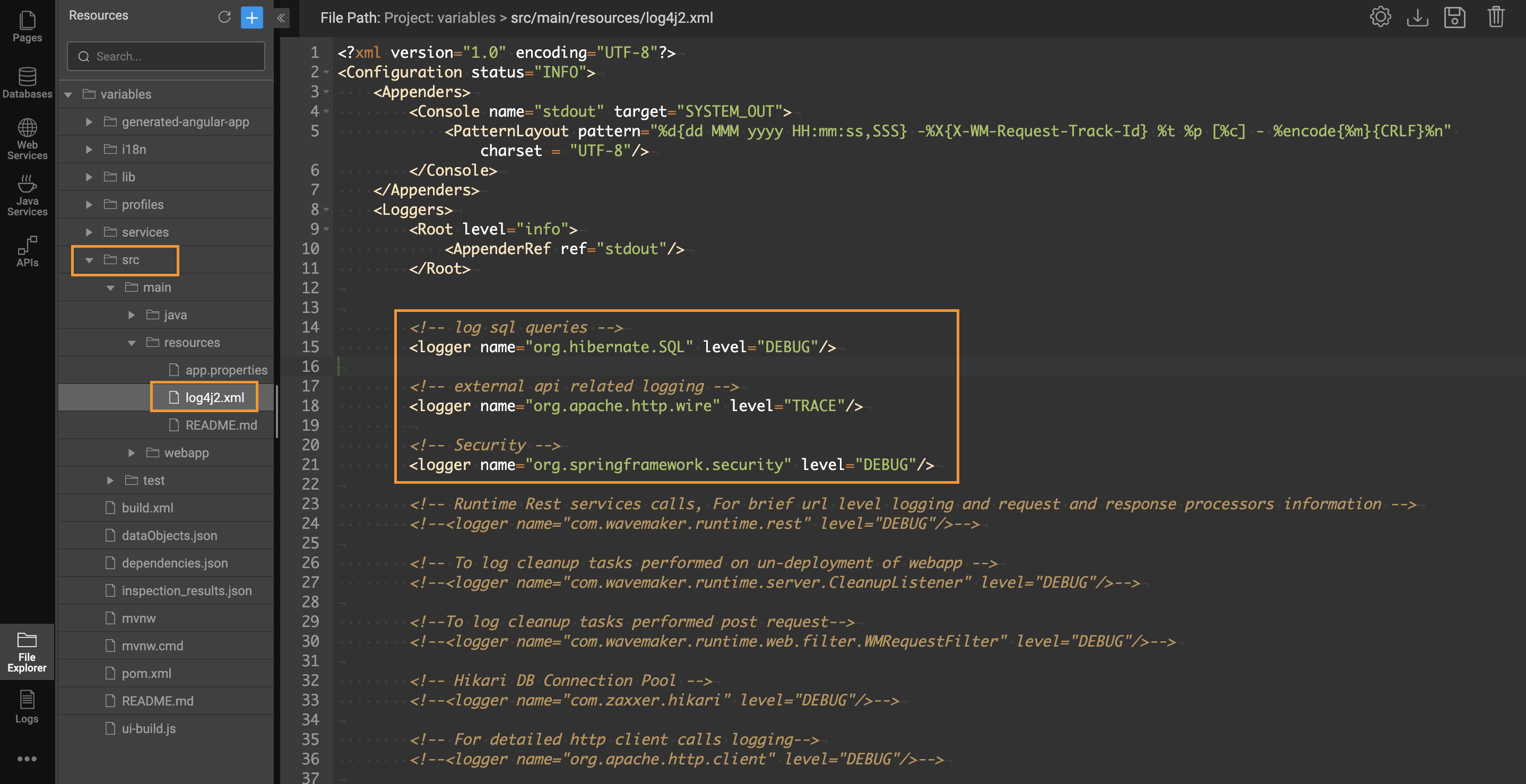To enable logs, include the following code snippet in the log4j2.xml file in the src folder under the FileExplorer panel.
