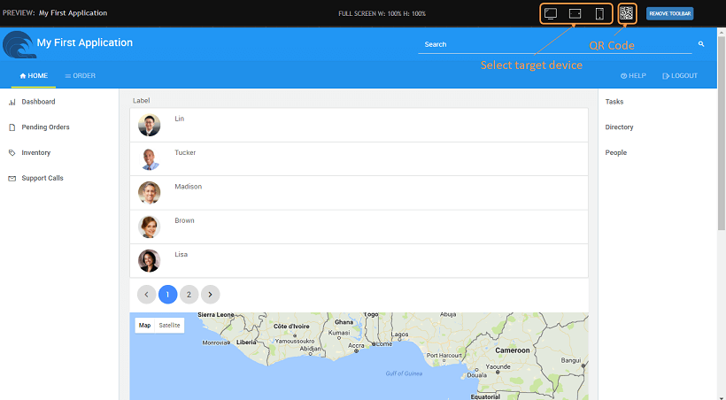 • An Application Preview will be displayed, where one can select the target device to run the app. This will give you an idea of how the app looks on various devices like various laptop, tablet, and phone sizes.
