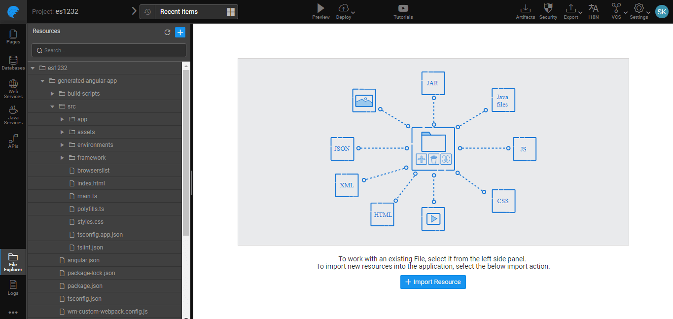 The ‘generated-angular-app’ is Angular 7 compliant project structure of the WaveMaker application as shown in the image below. The content in this section is Read-only.