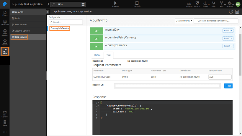 • The user can also test the API from the test tab, by passing values to the parameters and using the TEST button.