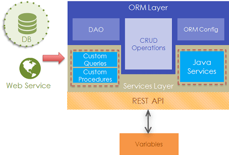 ORM Layer is auto-generated from DB schema using Hibernate & JPA. Services Layer is auto-generated using Spring. Custom queries, procedures, and Java Services can be used to extend the app functionality. For all these services, REST API is auto-generated using Spring-REST/Swagger. Variables interact with REST API layer to access the services.