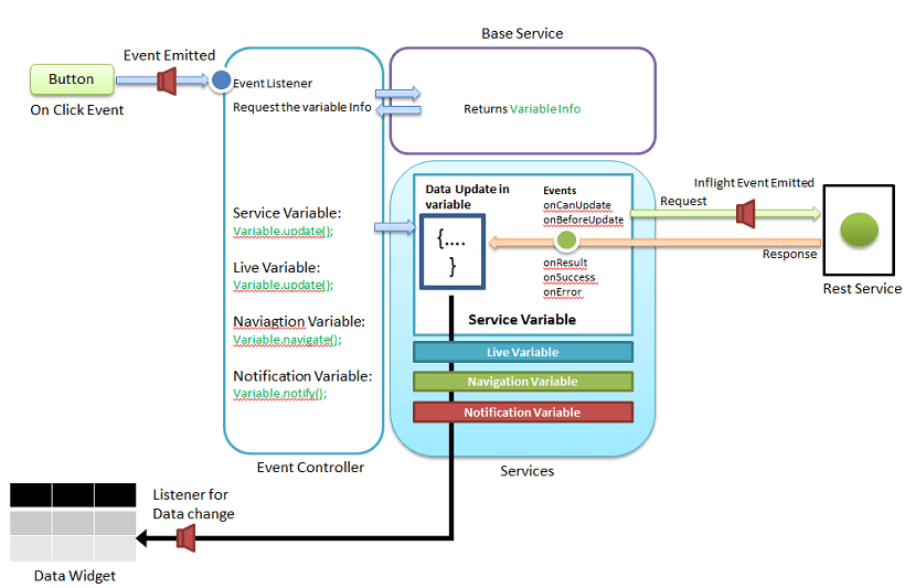 A Variable is a non-visual component that is used to call web services, custom database queries and Java methods. Variables can be invoked by Service Calls and by handling the call events. Using variable events ensures: