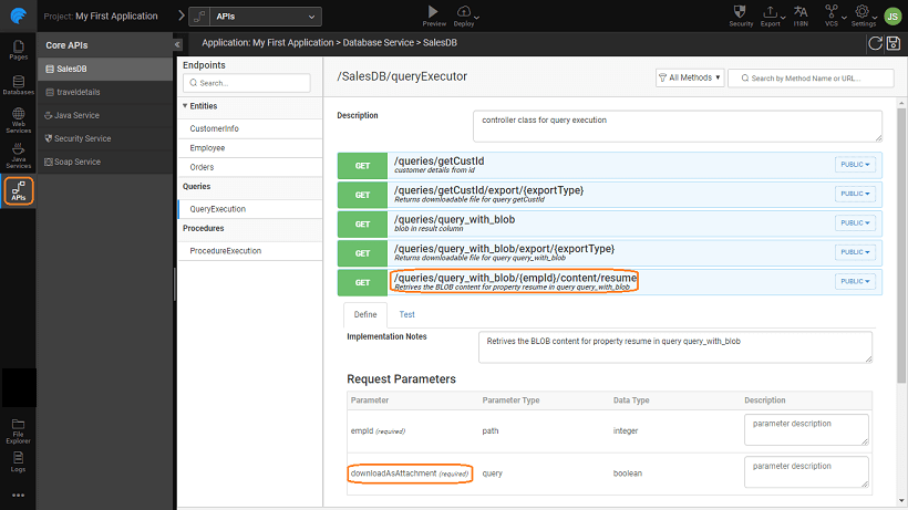 • Separate API will be generated for each Blob field with a Downloadable return type in addition to the executeQueryAPI. The response of the execute query's Blob field's value will contain the absolute URL to the Blob content. It will be null for the rows which do not have a value for that field.