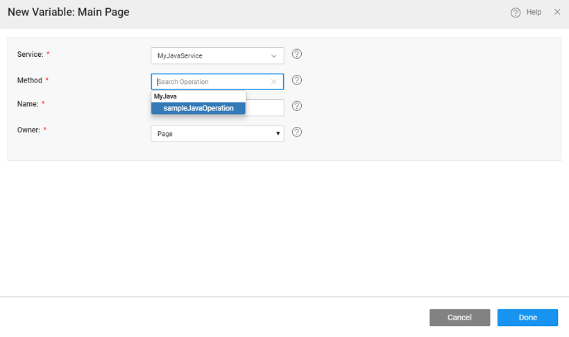 You can invoke the Java Service by triggering a call to the Service Variable generated. In case you have multiple public class methods in your Java Service, you will see multiple Operation options.