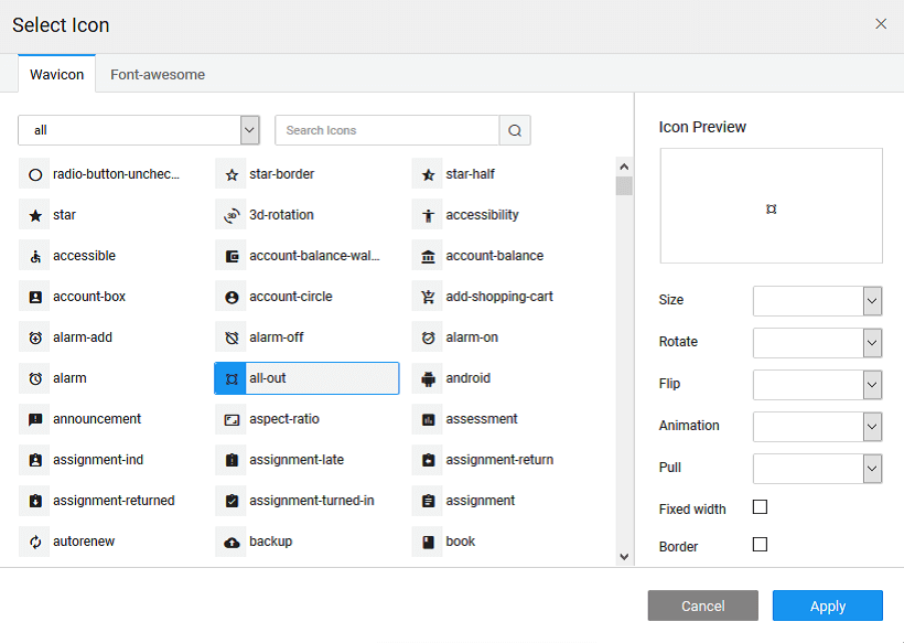 2. From the icon selector on the left of the Icon Class property, you can: