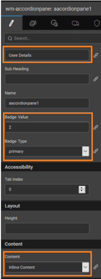 NOTE: In Safari browsers, by default, Tab highlights only text fields. To enable Tab functionality, in Safari Browser from Preferences -> Advanced -> Accessibility set the option "Press Tab to highlight each item on a webpage". | | Layout | | Height | The height of the widget can be specified in px or % (i.e 50px, 75%). | | Content | | Content | Bindable property, specifies the content to be displayed within the Accordion Pane: - Inline Content - HTML content or any widget. - Page Content - in the form of Partial pages created within the app, choose from the available list. | | Behavior | | Show | Showing determines whether or not a component is visible. It is bindable. | | Is Default Pane | This bindable property determines if this pane is the default pane. | | Graphics | | Icon Class | This bindable property defines the class of the icon that is applied to the button. |