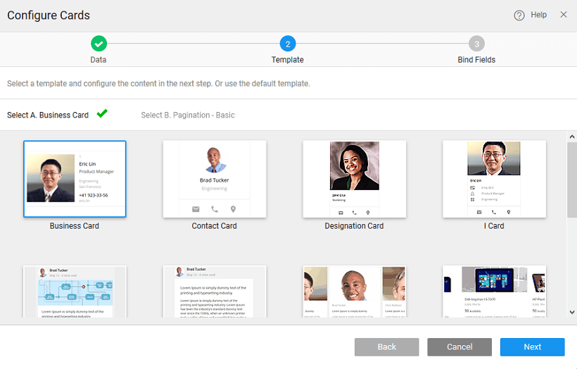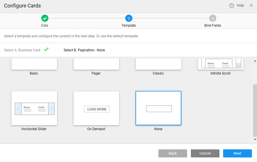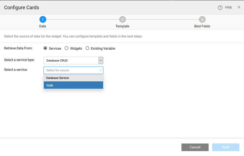 There can be different scenarios to deal with when configuring your Cards Widget with a data source. The data source can be in the form of a service - database, web or Java; or from an another widget on the page.