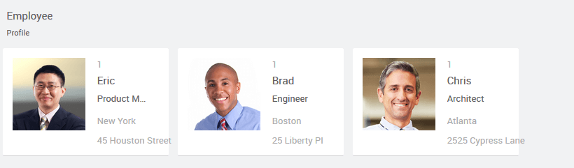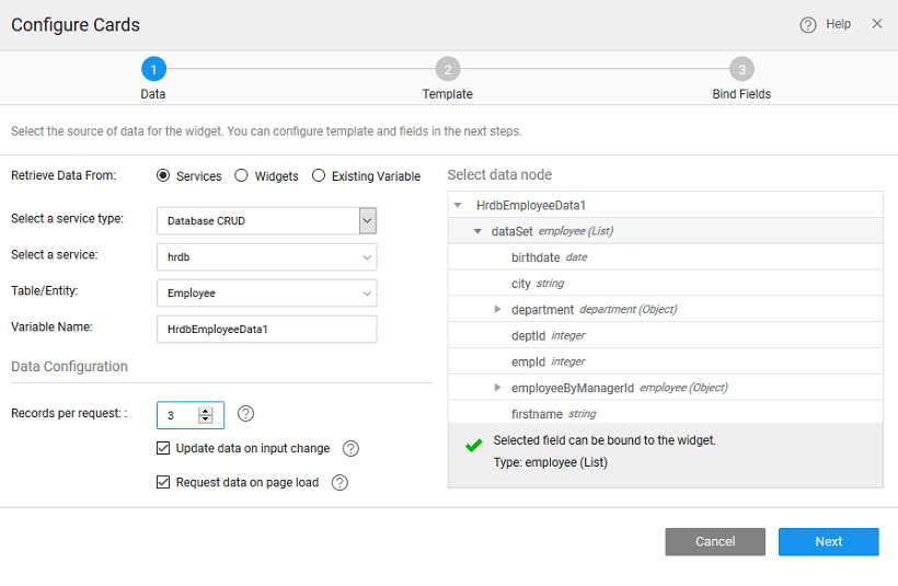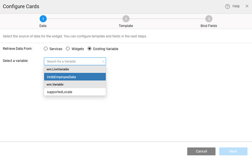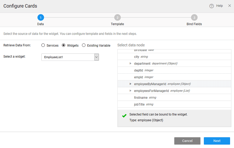 There can be different scenarios to deal with when configuring your Cards Widget with a data source. The data source can be in the form of a service - database, web or Java; or from an another widget on the page.