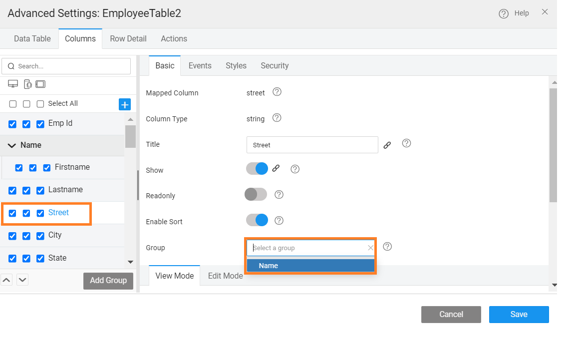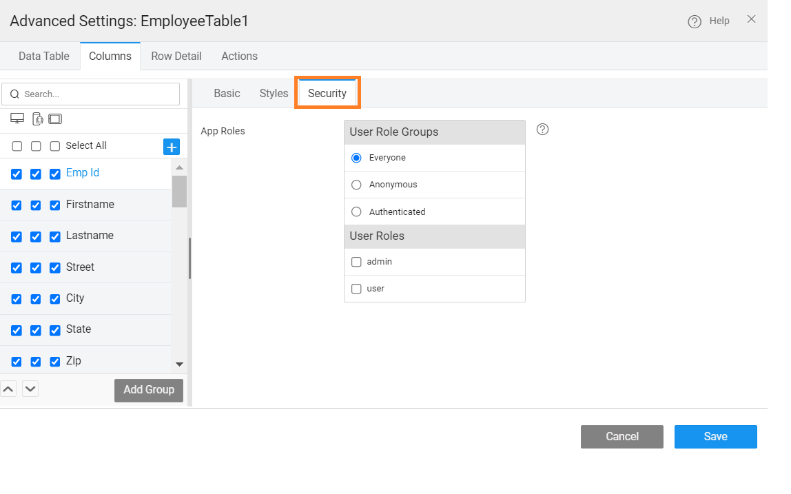 • Value Expression - You can write a custom expression to change the display setting for a table column. The expression needs to follow AngularJS conventions for binding. A sample expression is given which can be enhanced as per the needs of the application.