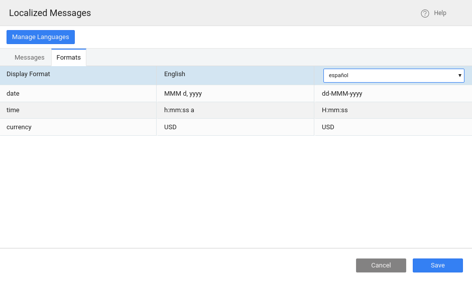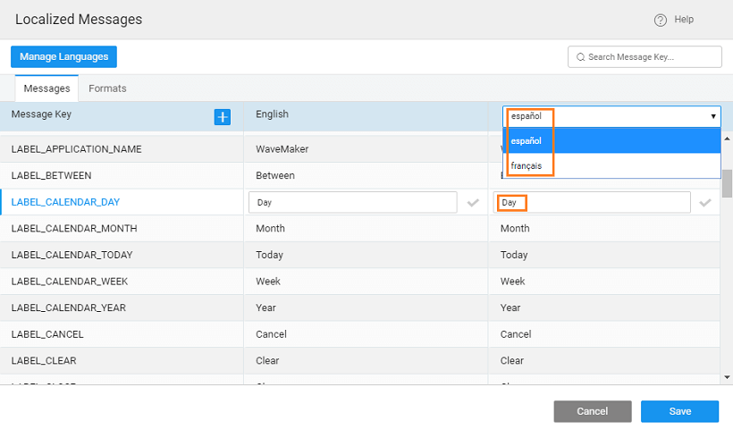 When the user selects a Language on your application or when you set the default language of the app from the Project Settings dialog, WaveMaker applies the relevant locale settings to show the messages as per its value for that locale.