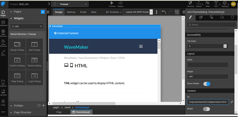 Note: Since WaveMaker is secured, only secure URLs can be displayed in the Iframe.