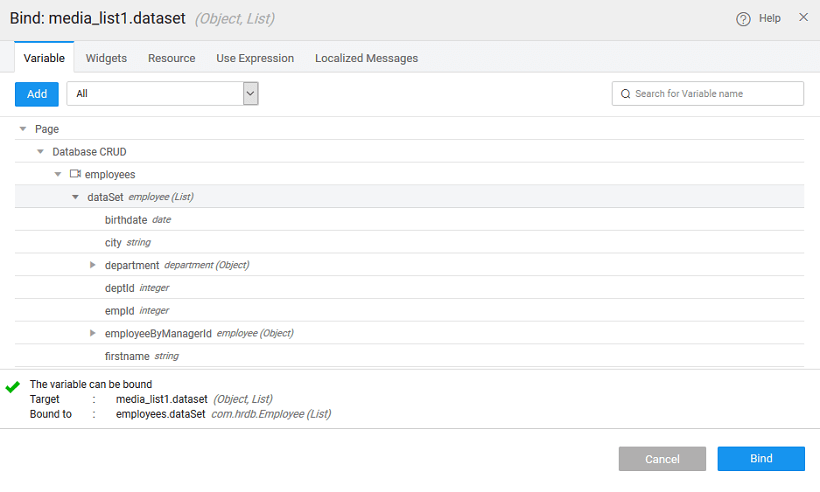 2. Bind the dataset value property of Medial List to ‘employees’ live variable dataset created in the previous step.