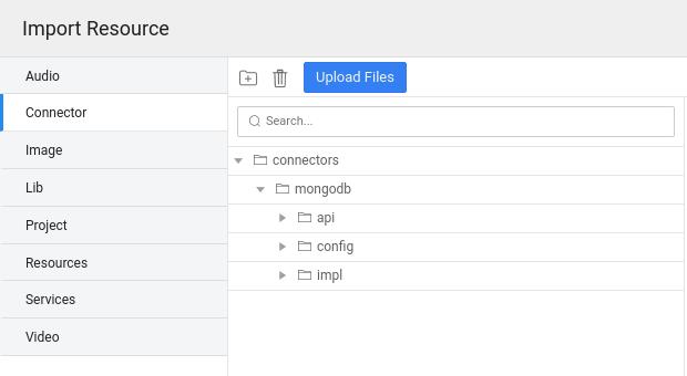 In WaveMaker studio, import the Connector zip in the import resource dialog. Import resource allows you to import the Connector zip artifact.