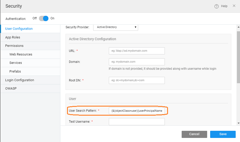 • enter the User Search Pattern as (&(objectClass=user)(userPrincipalName={0}@yourdomain.com)) (more about search filter)