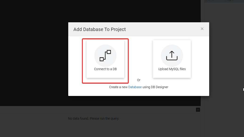 1. Navigate to the Databases section and click on the plus icon to add the Database to the project. From the popup, choose Connect To a DB option.