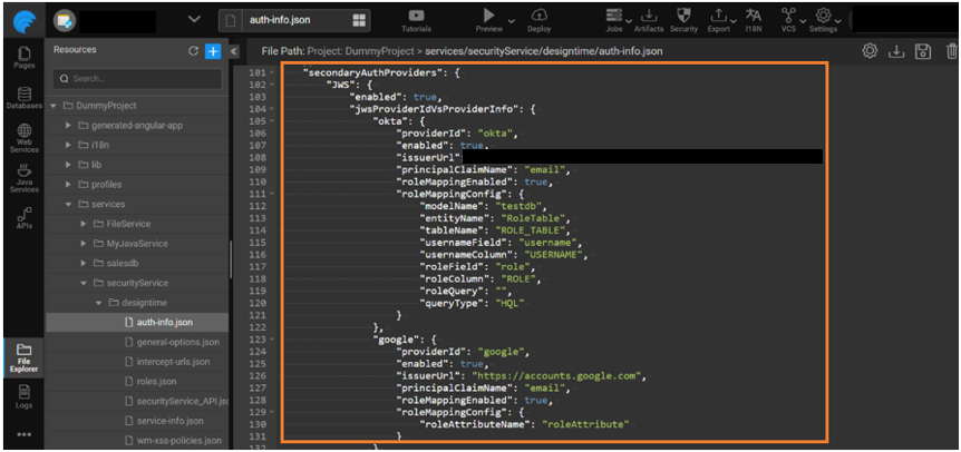 Configure a role table and once the token is authenticated the current logged-in user role is retrieved from the database. Add the modelName, entityName,tableName, usernameField, usernameColumn, roleField, roleColumn or roleQuery, queryType in the JSON structure as shown below for the Okta provider.