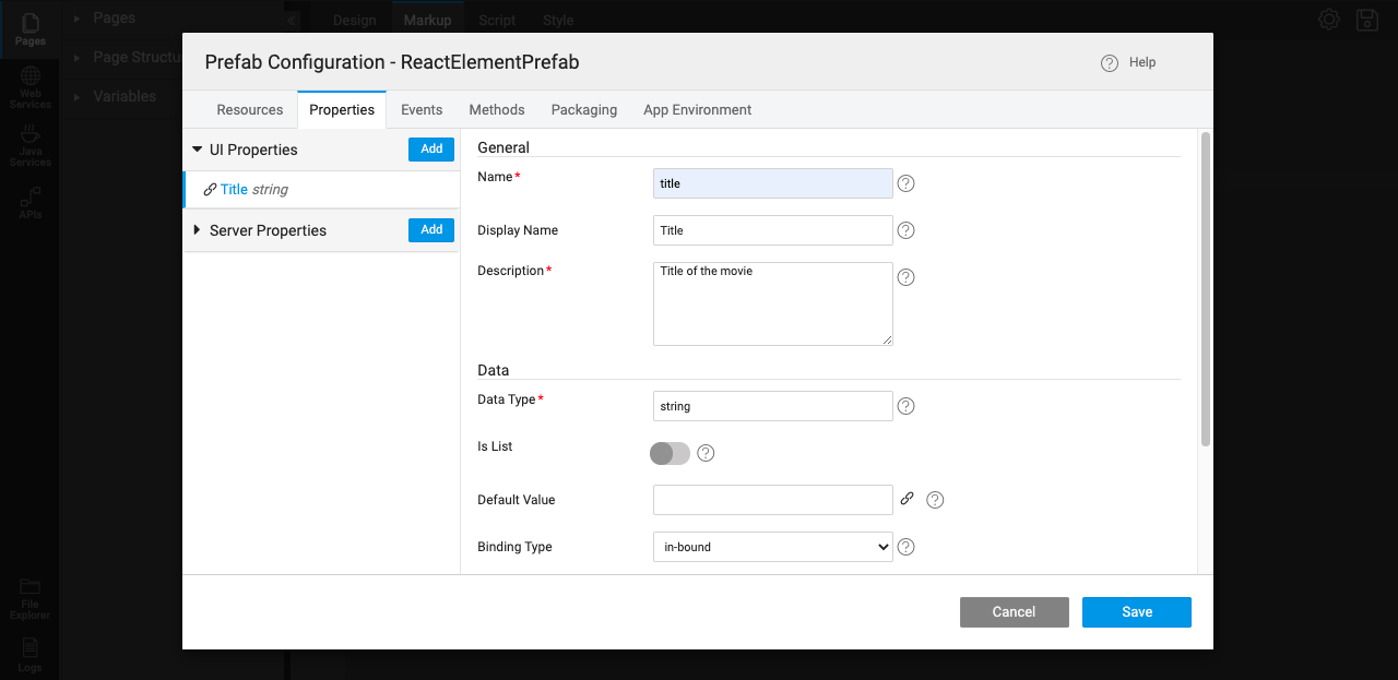 • Inorder to communicate with web components, Prefab has an option called Properties under Prefab Configurations as shown below.
