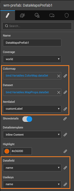 From the Properties tab, set the UI Properties for the Prefab to configure from an app. In this case, you add scope and dataset. For example, scope lets you choose a particular country map, or a world map.