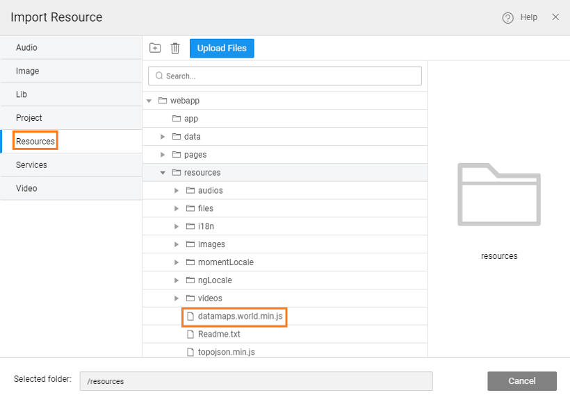 2. Select the folder where you want the resource to import. For this example, select the resources folder and upload the topojson.min.js and datamaps.world.min.js files.