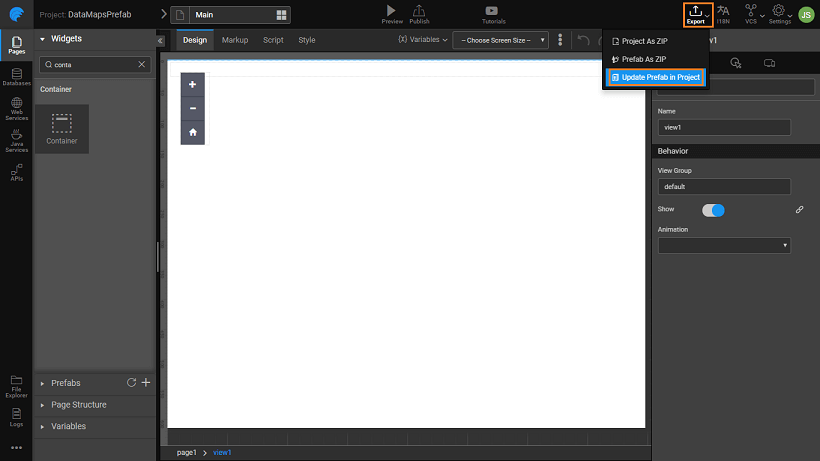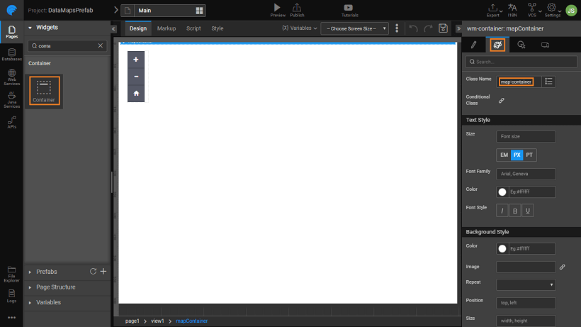 Drag and drop a Container Widget onto the canvas, and provide a Name: mapContainer, and set the Class Name: map-container.