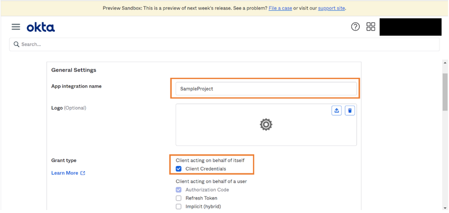 1. Enter the App Integration Name and check Client credentials as Grant type.