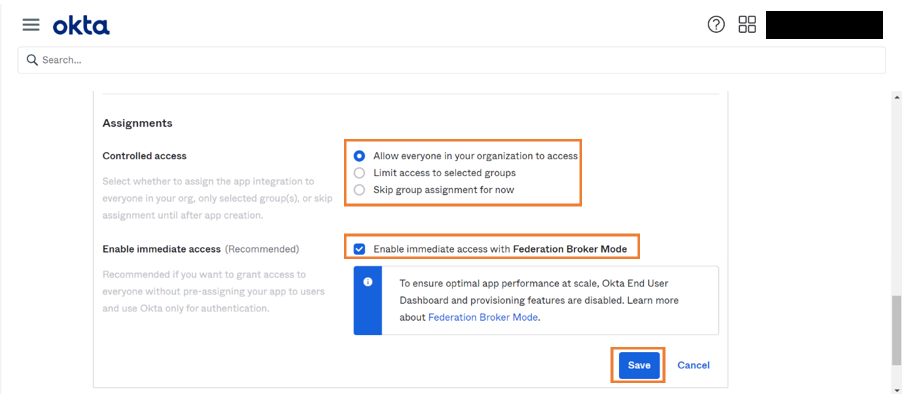 1. Select the appropriate access restriction and click Save. This steps ensures domain restrictions to access the application.
