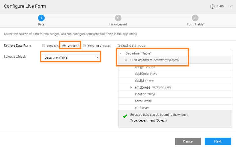 • Choose the Data Table (grid) selected item as the datasource for the Live Form. This will set the initial values that will be displayed in the form. form_bind_dt