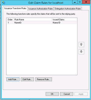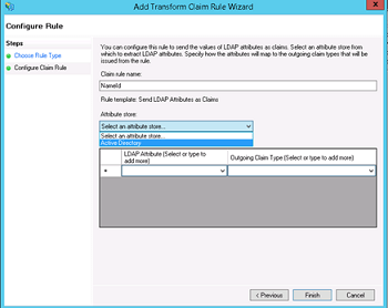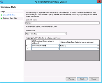 10. Add NameID as "Claim rule name", choose "Active Directory" as Attribute store, choose "SAM-Account-Name" as LDAP Attribute and "Name ID" as "Outgoing claim type", finish the wizard and confirm the claim rules window, in ADFS 3.0 you might need to configure the Name ID as a Pass Through claim - As we are using Spring SAML Security it expects the Name ID Parameter in the Spring SAML Response. adfs_11