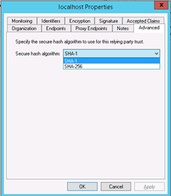 11. Open the provider by double-clicking it, select tab Advanced and change "Secure hash algorithm" to SHA-1 adfs_12
