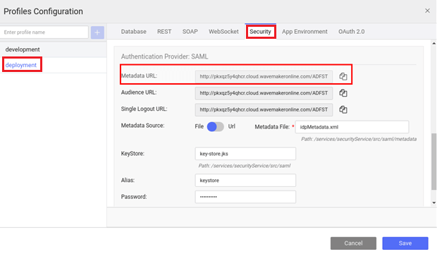 2. Configure ADFS Federation Metadata details in WaveMaker App. You can either use the URL or upload file.