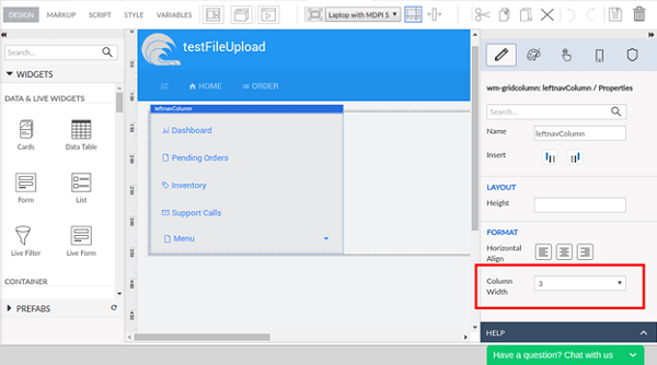 1. Add a grid layout (let’s name it as leftnavColumn, this name will be used in further implementation) in the Main page content. For the gridcolumn first grid row, specify the columnwidth as 3.