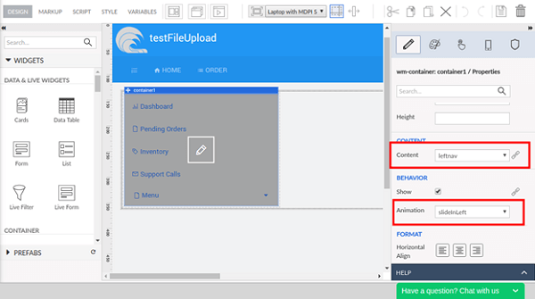 <wm-container name="container1" content="leftnav" animation="slideInLeft"></wm-container>