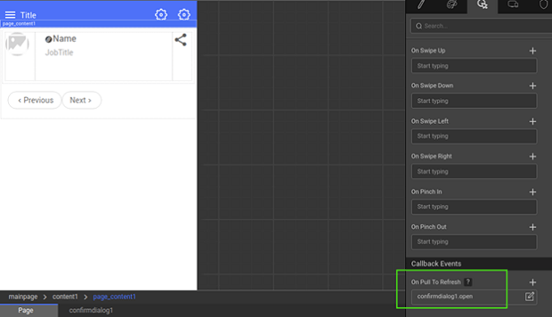 1. Set an action to the Pull to Refresh event. For example, open a dialog as shown below.