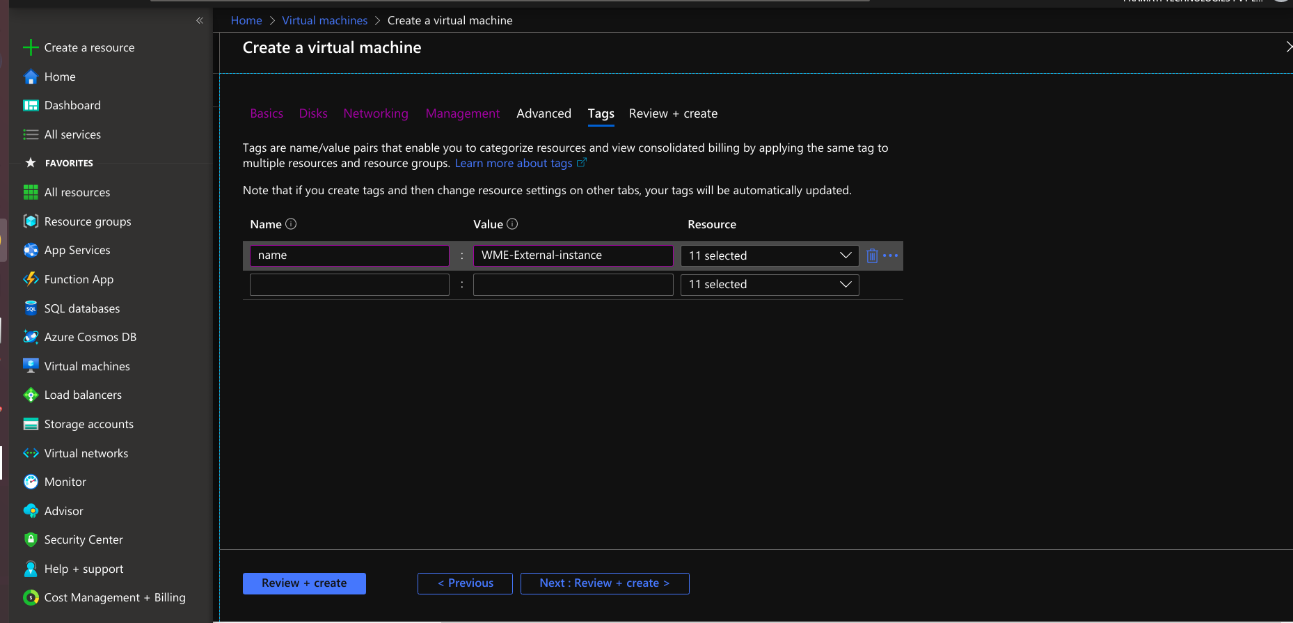 - Provide tags that are name-value pairs for the virtual machine for categorizing the resources.