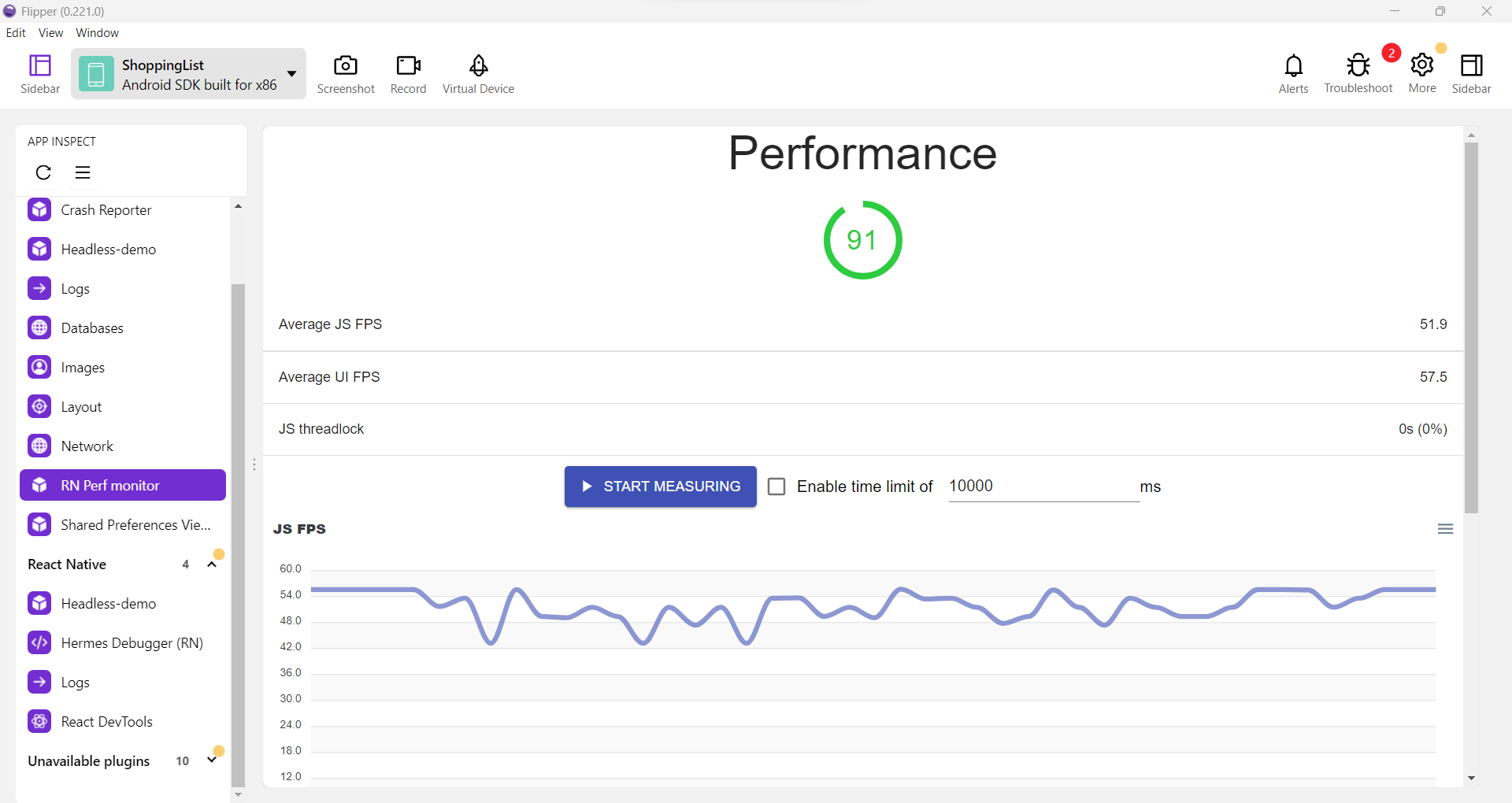 RN Perf Monitor is a flipper plugin that gives a performance score for mobile apps from BAM.lab.