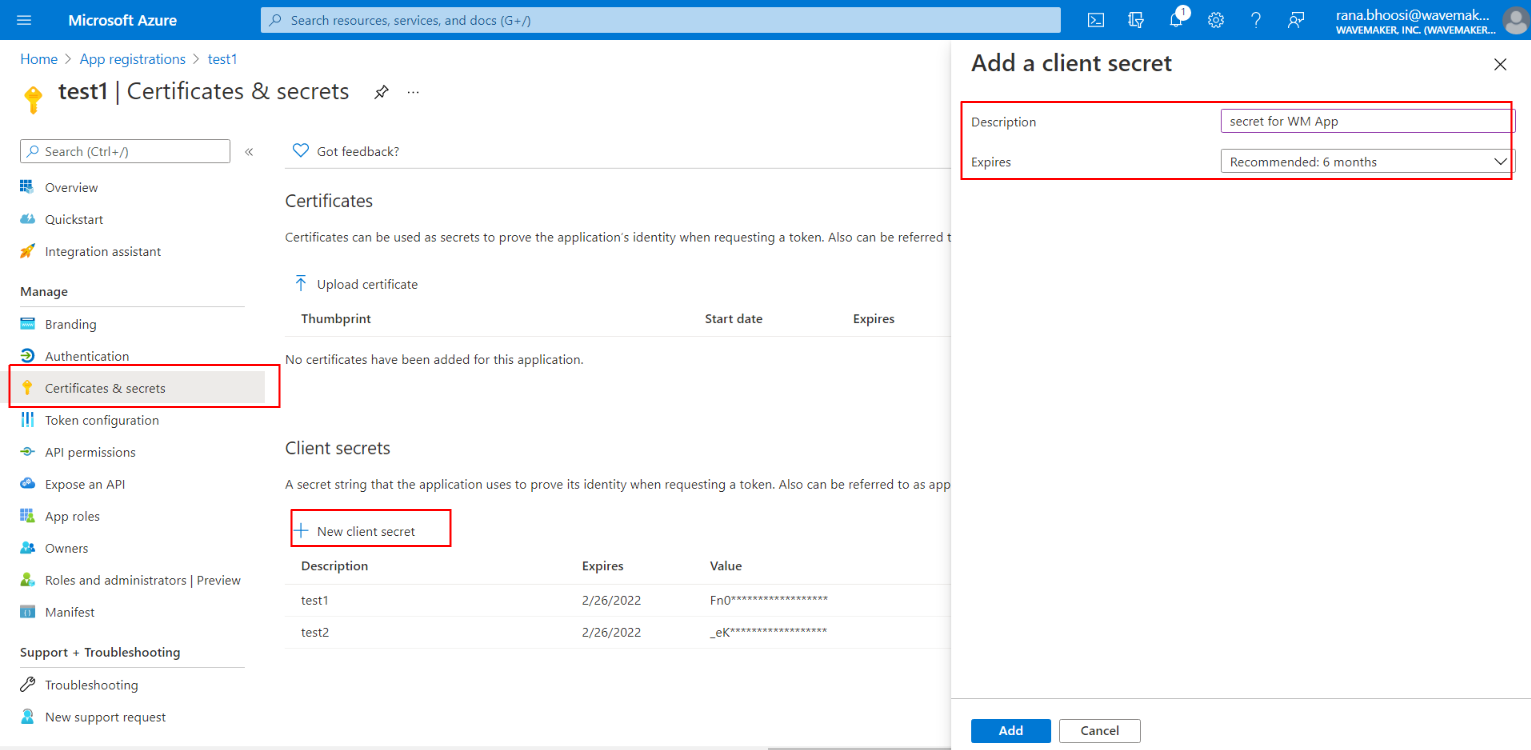 - In the left panel under App Registration, click Certificates and Secrets then Create New Client Secret and copy the secret value.