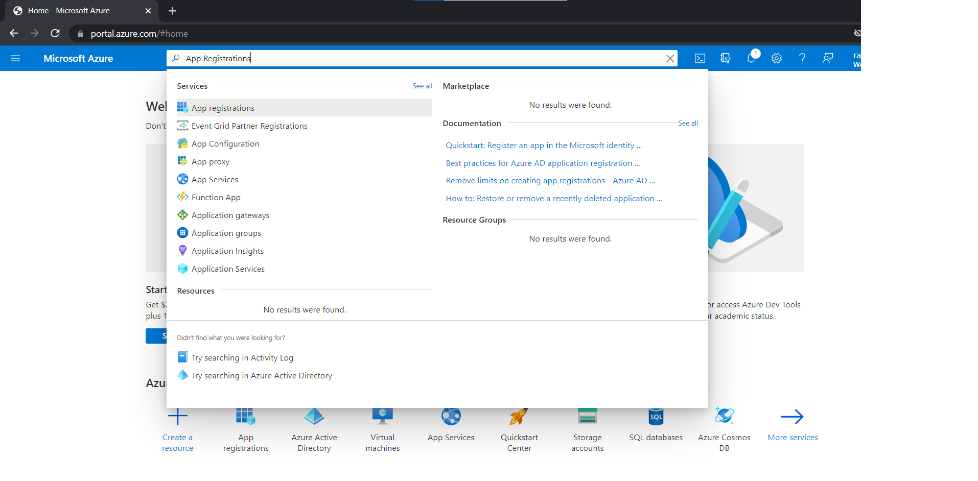 Search for App Registrations from the top navigation bar and click it.