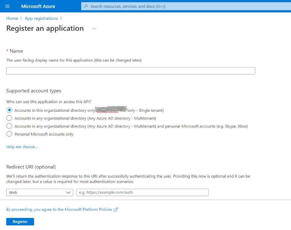 - On the App Registrations screen, click New Registration and provide the app name, account type, and redirect URI.